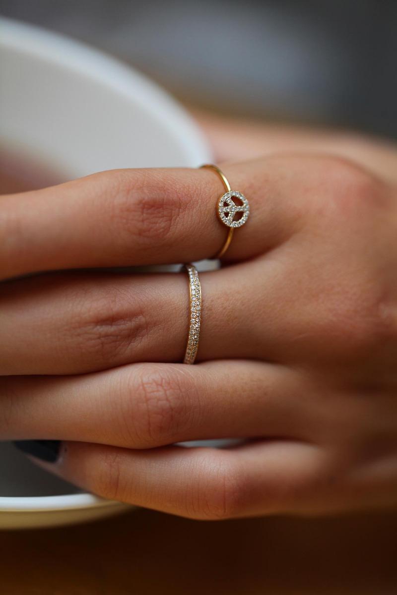 Это так мирно ... Символ "мир и любовь" украшен бриллиантами 0,12 карата и доминирует над тонким золотым кольцом из 18-каратного кольца для этого гладкого дизайнерского кольца. Это доступно в трех цветах золота.