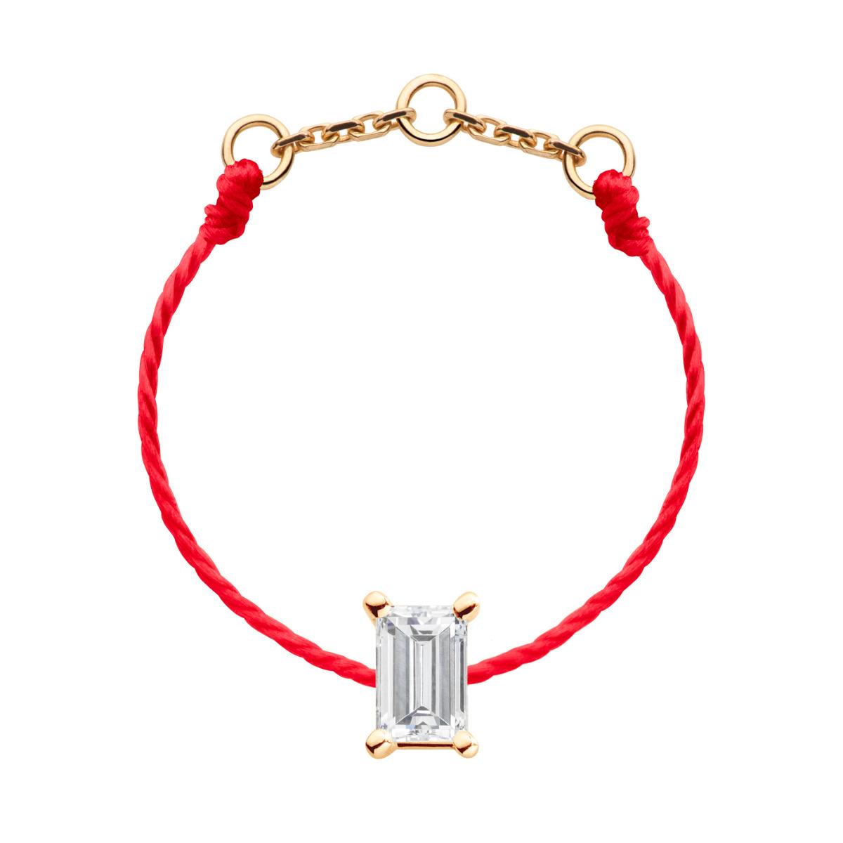 Откройте для себя выдающуюся фигуру современности, шикарную непринужденность парижских женщин - это она, кольцо с нитью Comtesse. Багетный бриллиант, ограненный в форме прямоугольника, свисает с талисмана на цветной нити, создавая ультрасовременный результат, одновременно элегантный и эклектичный.