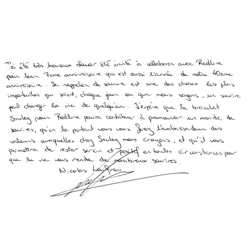 На протяжении семи лет RedLine сотрудничает с семью известными дизайнерами для уникального сотрудничества в интересах Sidaction для совместной борьбы со СПИДом. В этом случае улыбающееся лицо Смайли выложит 469 бриллиантов (1,91 карата) и подарит радость и энтузиазм этому колье из цепочки из белого золота и желтой нити, излучающей благополучие. Застежка из 18-каратного золота и шкала из трех колец будут регулировать размер драгоценного камня.