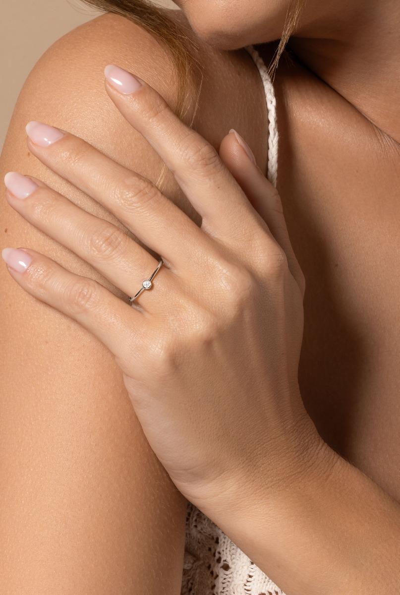 Это так деликатно ... Бриллиант весом 0,05 карата, установленный на закрытой оправе, доминирует над изящным 18-каратным золотым кольцом для этого элегантного кольца. Это доступно в четырех цветах золота.